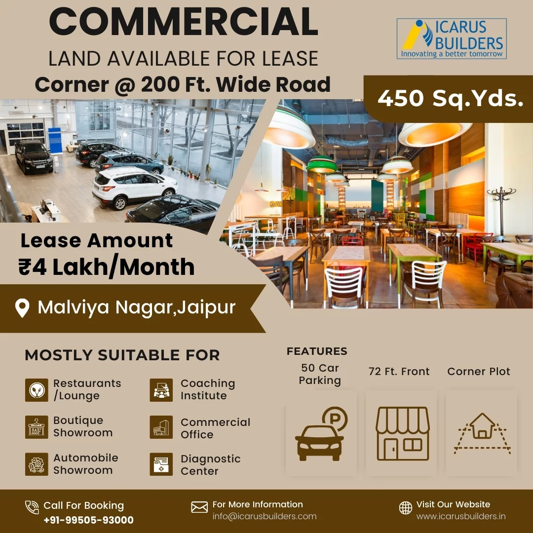This prime commercial land in Malviya Nagar, Jaipur, offers an excellent opportunity for businesses seeking a strategic location with high visibility and ample parking space. Contact us now to seize this opportunity and bring your business vision to life.