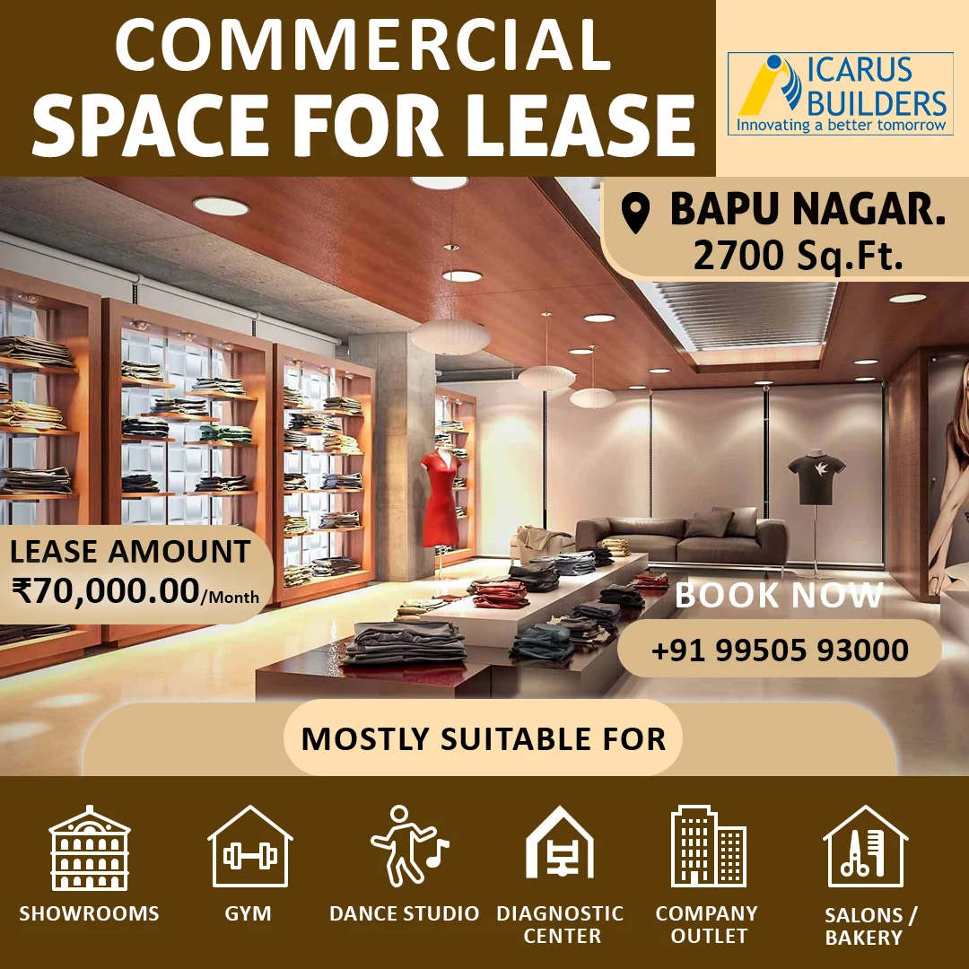 This commercial space offers versatility and convenience for various business ventures. Don’t miss the opportunity to lease this prime location in Bapu Nagar, Jaipur. Contact us for further details and inquiries.